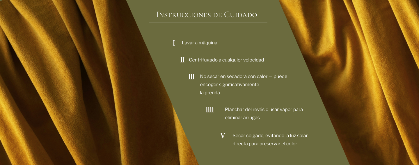 Se puede lavar a máquina hasta 30 °C. Use un detergente suave para mantener la textura lujosa y la intensidad del color.